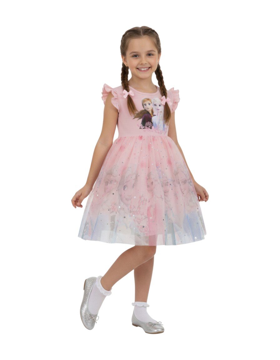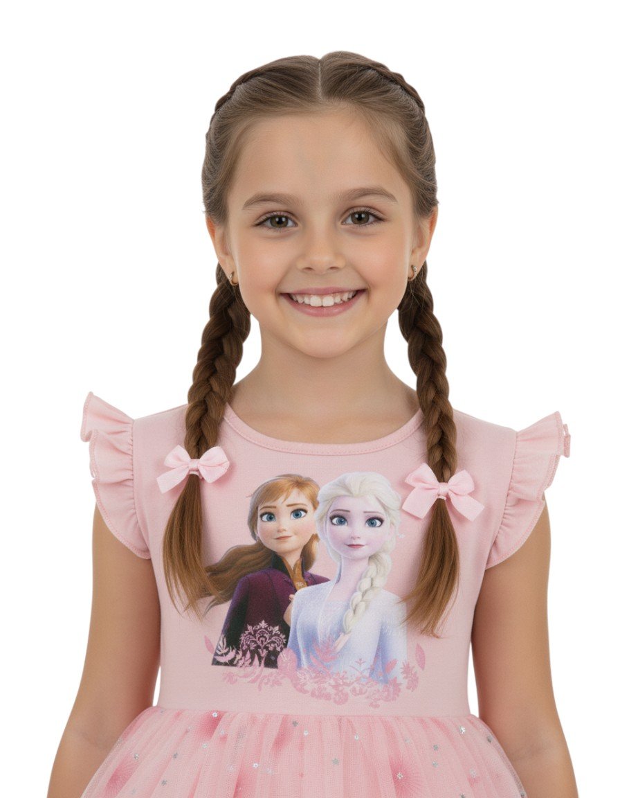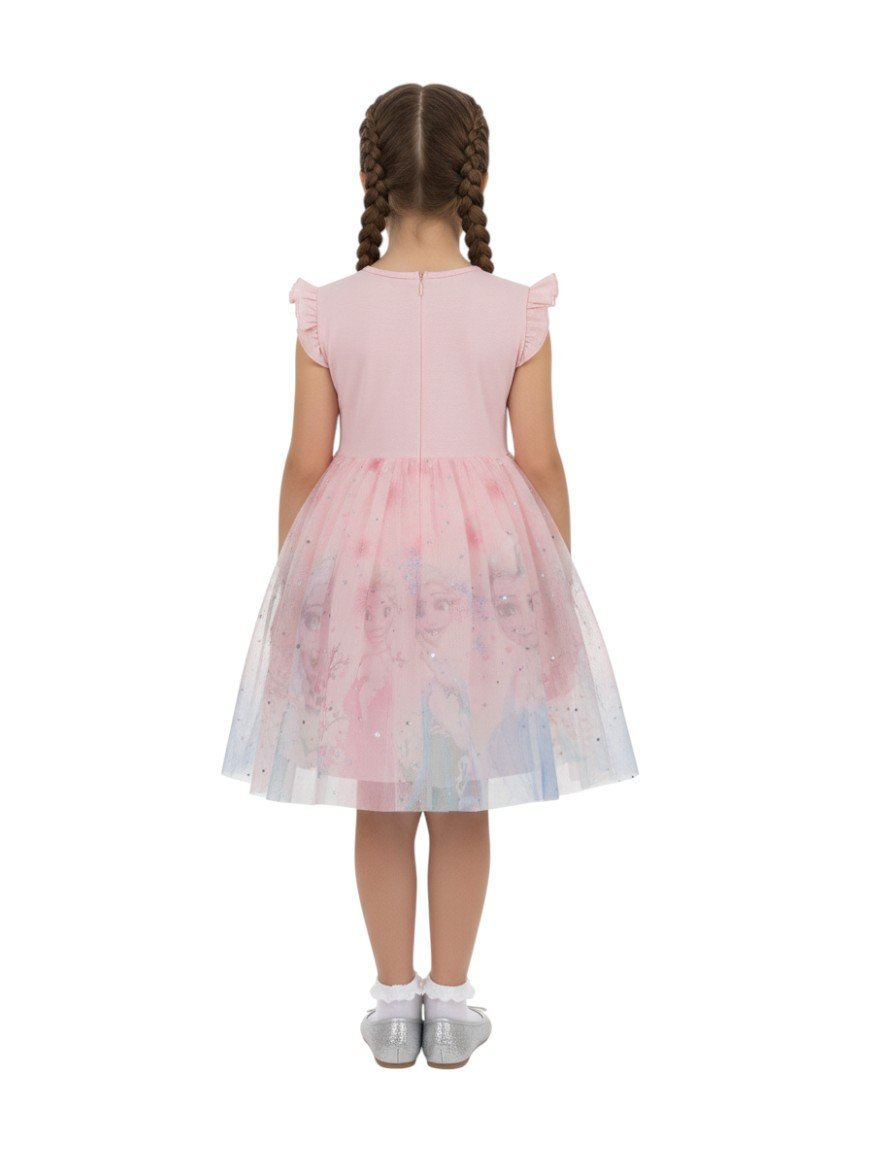 Designed in a soft and cheerful pink shade with an all-over self-print featuring Elsa and Anna, this dress blends playful character charm with everyday comfort. The slip-on style (no zipper) makes it easy to wear, offering both convenience and comfort for active little princesses.