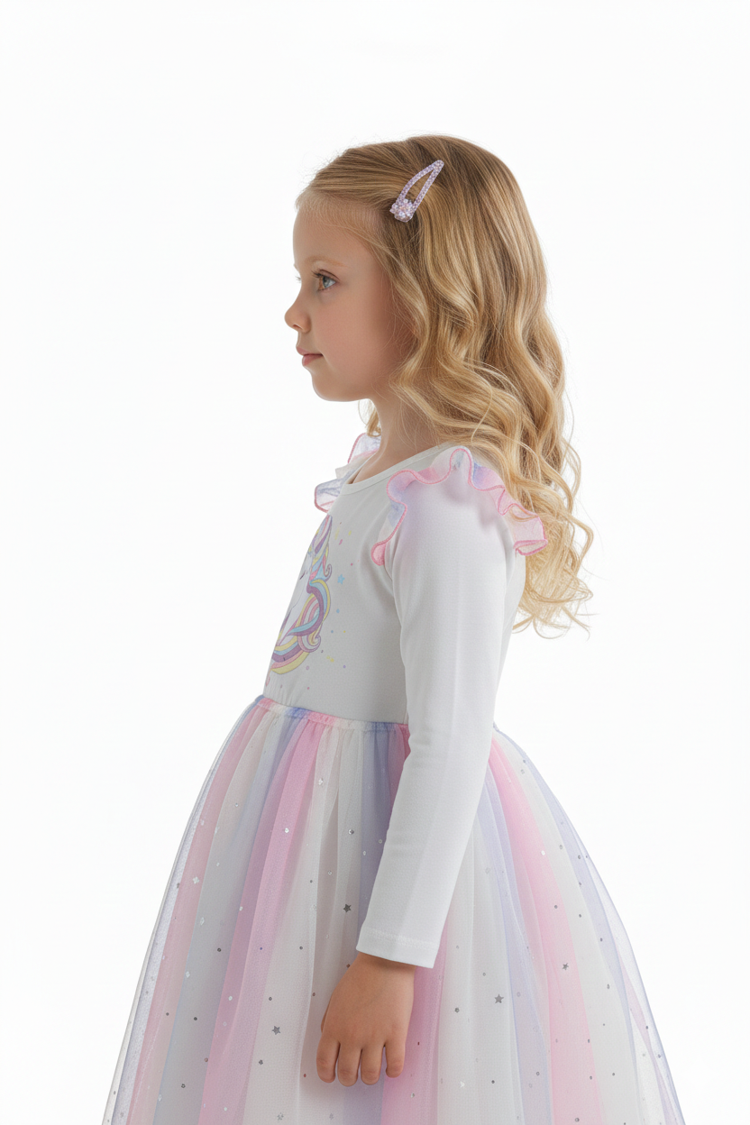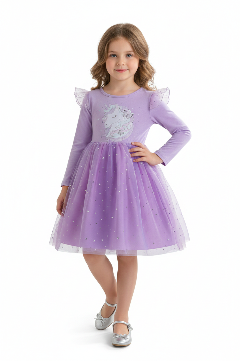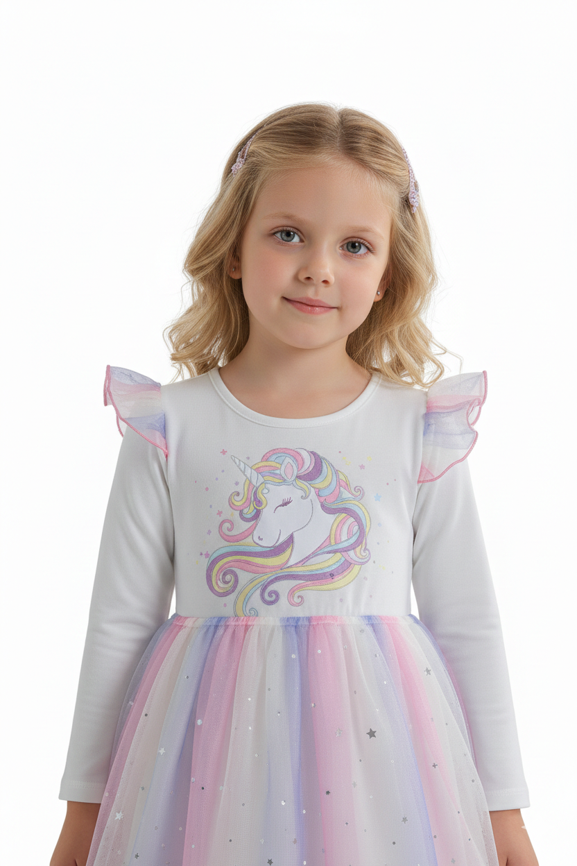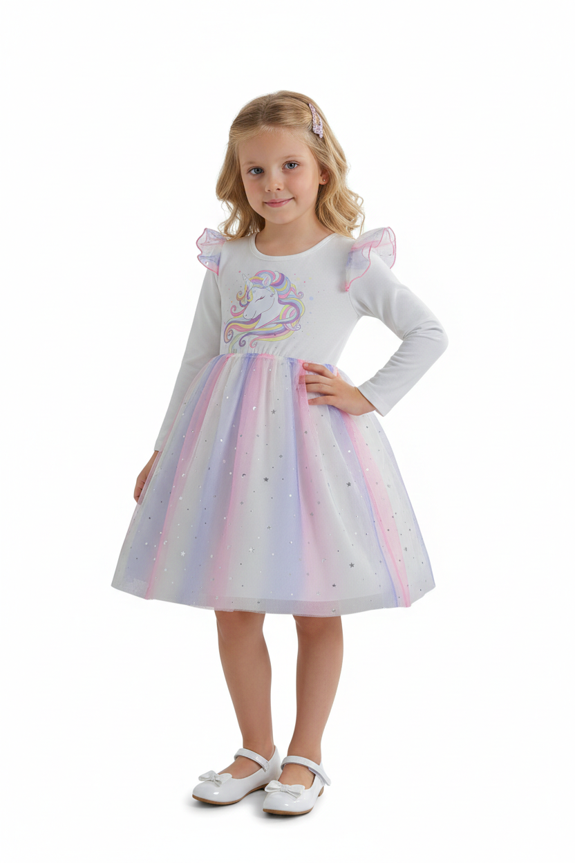 The Starlight Sparkle Unicorn Dress – White & Purple – 2Y to 8Y is perfect for little girls who love unicorn magic and sparkling style. 🦄💜 With its elegant colors and shimmering details, it’s ideal for special occasions and magical memories.