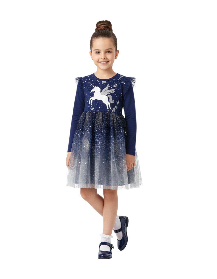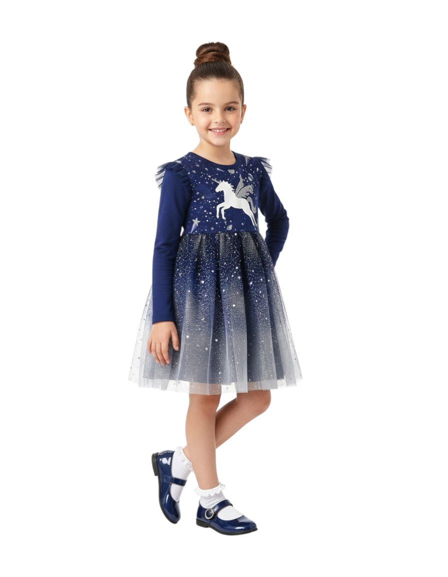 Made for toddlers and young girls aged 1 year to 8 years, this dress is ideal for birthday parties, themed events, school days, family outings, and special occasions. The enchanting unicorn design paired with twinkling stars creates a look that is both elegant and playful.